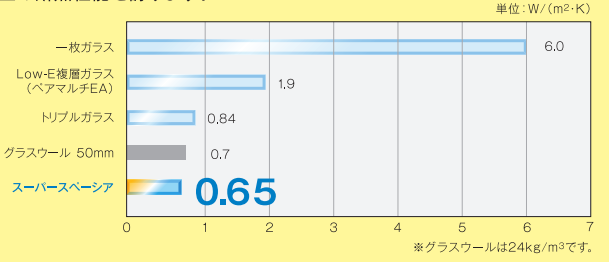 スーパースペーシアはLow-e複層ガラスの3倍の断熱性があります。
