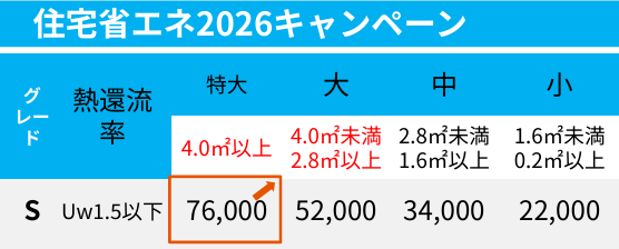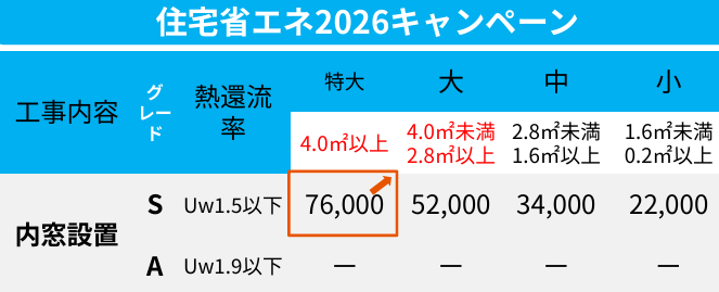 4㎡以上(例えば2m×2m)の窓なら補助金が76,000円になります。