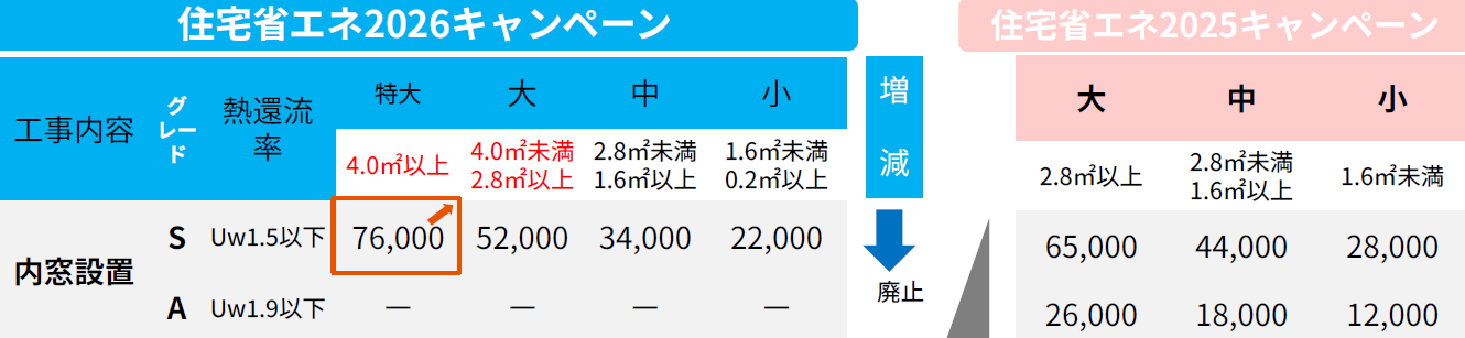 大きい窓だと7万6千円で小さい窓だと22,000円の補助額です。