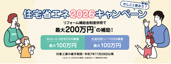 先進的窓リノベ2026補助金、みらいエコ住宅支援事業の2つの制度で併せて最大で200万円ですが